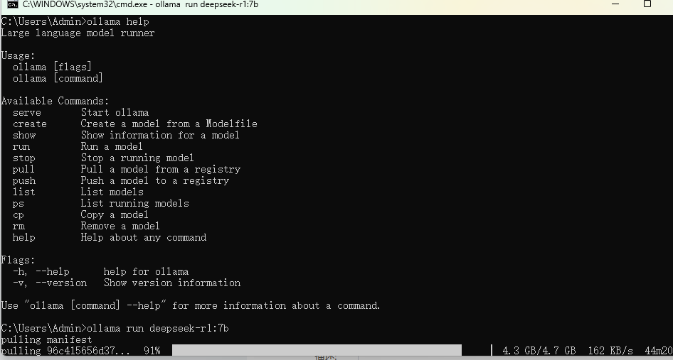 安装完成后验证一下安装成功,在Windows系统中按下Win+R键,输入cmd,然后按回车键;在Mac系统中打开Terminal应用程序。在终端中输入ollama help并按回车键,若没有报错,则表示安装成功。